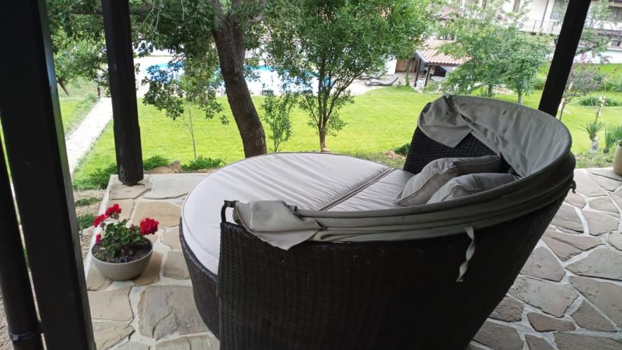 es gibt am nordöstlichen Eck des Grundstücks ein Gartenhaus, hier finden Sie Auflagen für die Liegen, Spielgerät vom Fussball über Federball bis Luftmatrazzen fürs Schwimmbad, im Gartenhaus sind ausserdem die Waschmaschine und der Trockner untergebracht - zur Nutzung unserer Hausdame (Svetoslava) und damit Sie weder durch Arbeiten im Garten, noch durch die Wäsche gestört werden