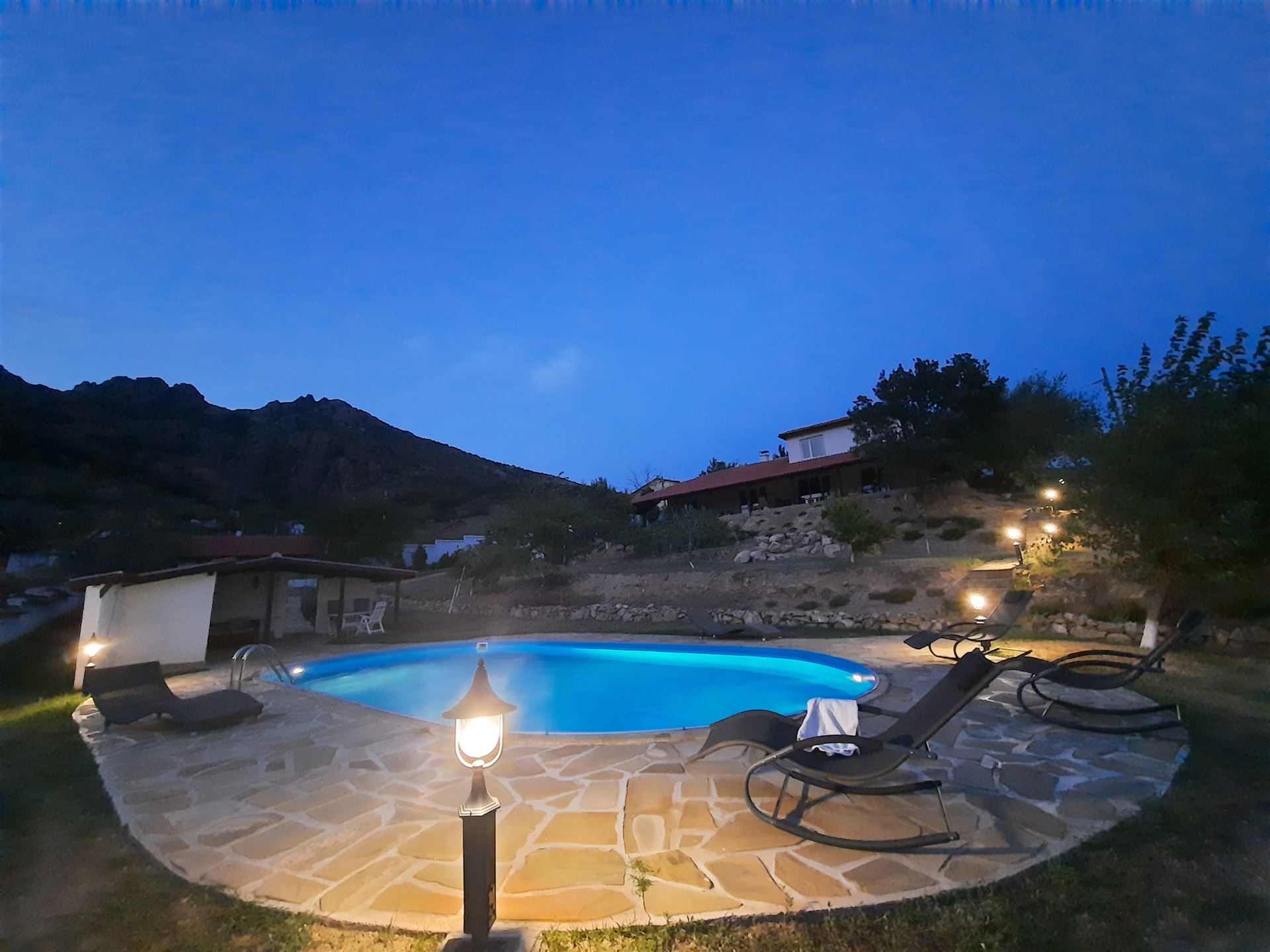 der ovale Pool hat 11m Länge, 5,5m Breite und 1,5m Tiefe, rund um den Pool ist gefliest, es stehen auch hier Liegen und Sitzplätze zur Verfügung, es gibt ein kleines Poolhaus, hier steht die Technik. Auch eine Aussendusche, eine kleine überdachte Küchenzeile und die Aussendusche.