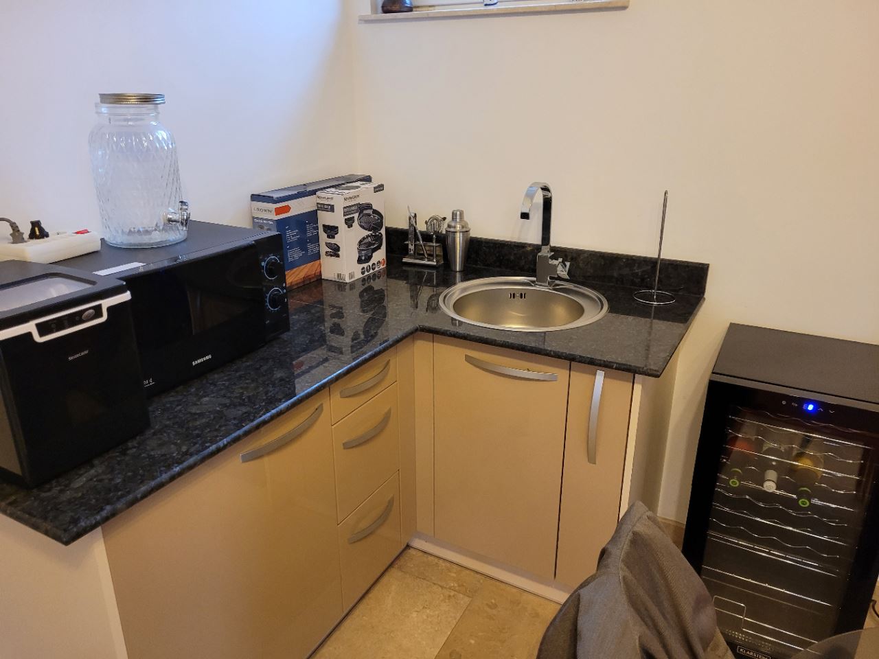Wein-Kühlschrank (rechts im Bild, normaler Weise finden Sie da bei Anreise ein/zwei Flaschen ordentlichen örtlichen Wein zum Probieren)