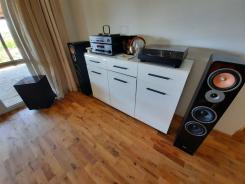 Das Bild rechts zeigt die Boxen Marke "Teufel" mit passendem Bass im Wohnzimmer.