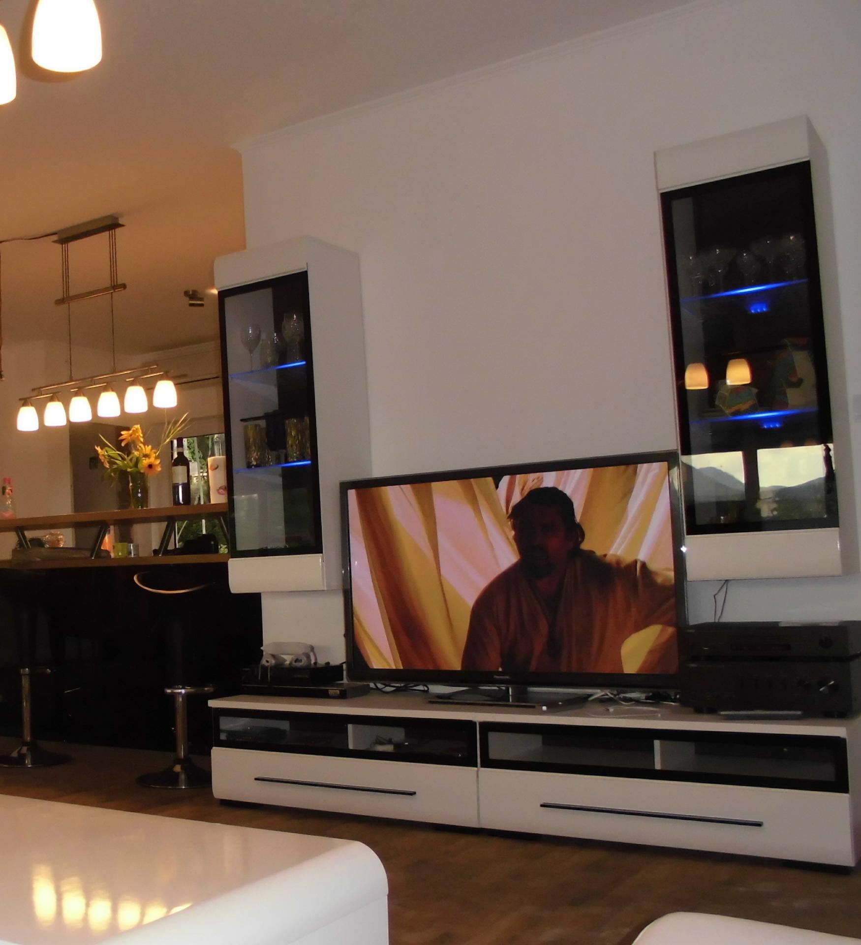 Im Wohnzimmer steht riesengroße Panasonic Full-HD-Plasmaschirm mit 50", dieser hat einen Panasonic blue-ray-DVD-Player angeschlossen mit 3D Funktion und 3 Panasonic-konforme Brillen.